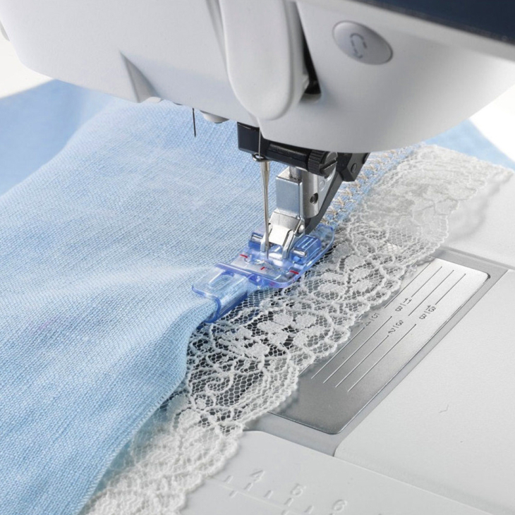 - Виберіть потрібну строчку. Наприклад: мереживо можна прітачать до краю вироби за допомогою прямої строчки і подвійний голки (відстань між голками 4 мм), або широкої декоративною строчкою, вирівняною уздовж правого краю.