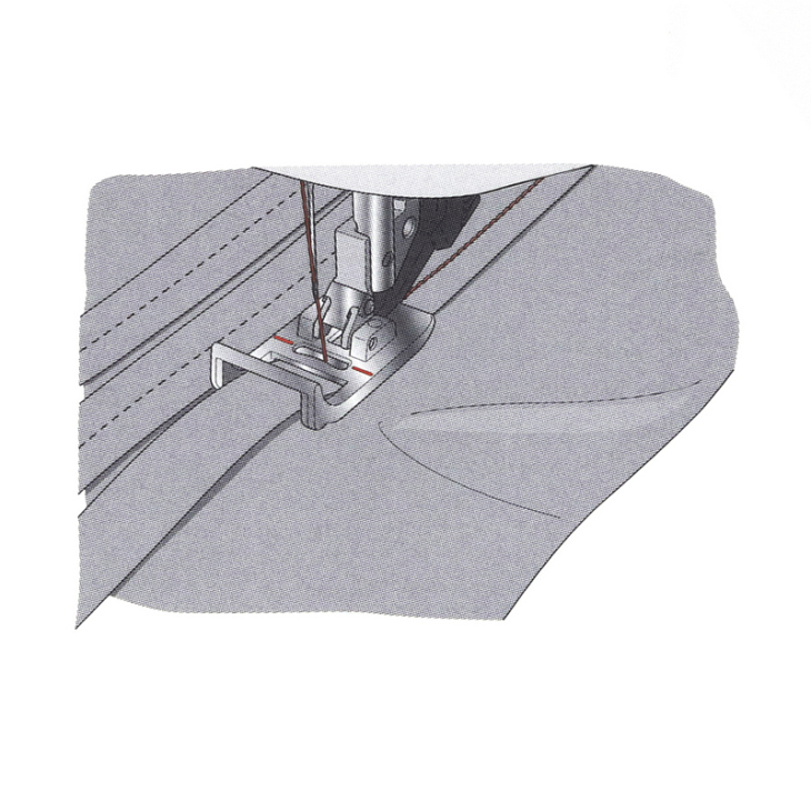 - Синельної лапка буде направляти смужки і пришивати на потрібне місце, формуючи стежки по центру смужок. (Підкладайте стабілізатор під тканину.)